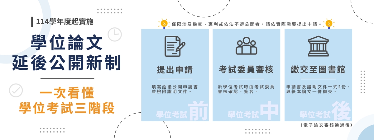 | 2025-12-24 | 14:10 ~ 16:00 | 114-1研究生 | <興研究‧攻略坊>論文上傳輕鬆CHECK!(線上課程)時間:2025.12.24(三) 14:10-16:00 (點我加入Google行事曆)