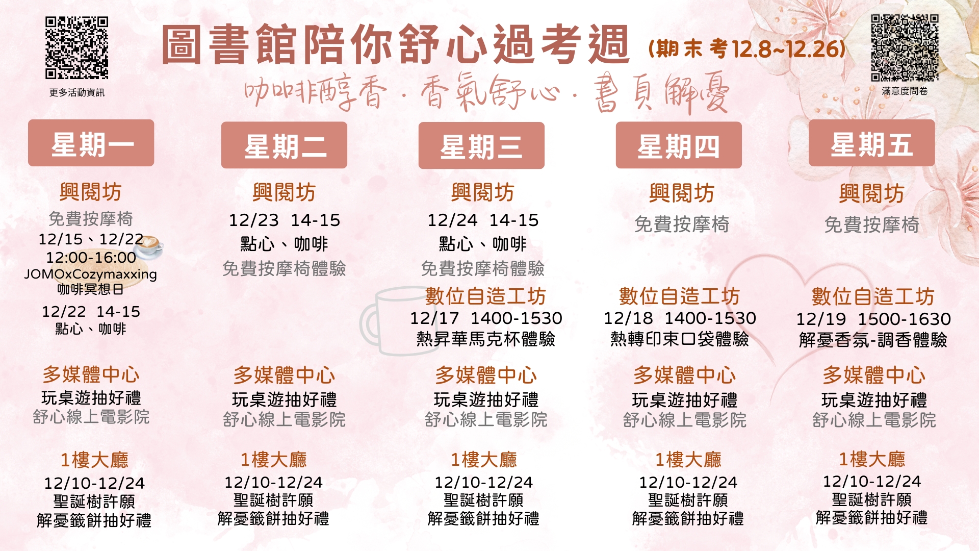 | 2025-12-22 | 12:00 ~ 16:00 | 全校教職員生 | 【舒心紓壓活動】JOMO x Cozymaxxing 咖啡冥想日.放鬆身心